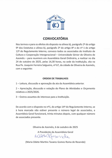 "Selecionado o nome da Universidade “Instituto de Cultura e Cooperação Intergeracional Universidade Sénior de Oliveira de Azeméis” e feito o seu registo, tornou-se imperioso encontrar, selecionar e adaptar um edifício onde pudesse funcionar a Universidade, o que se tornou bastante moroso."